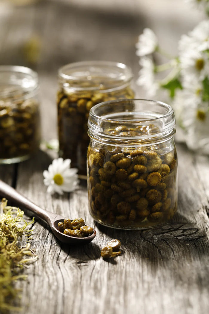 Saviez-vous que les boutons floraux de marguerites remplacent parfaitement les câpres dans les salades, tartares et sauces César? Eh oui, les marguerites sont de véritables petits bijoux de la nature! Leurs boutons sont croquants et légèrement poivrés, et nous les marinons dans une saumure légère à base de vinaigre de cidre pour un surprenant condiment de qualité supérieur. Et en plus, contrairement aux vrais câpres c'est un produit local, de quoi en impressionner plus d'un.